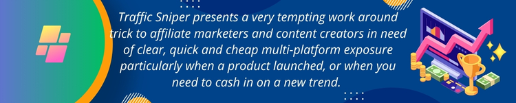 Traffic Sniper presents a very tempting work around trick to affiliate marketers and content creators in need of clear, quick and cheap multi-platform exposure particularly when a product launched, or when you need to cash in on a new trend. Its strategy concerning the content creation and establishment of power (through Wikipedia references) is new and beginner friendly.